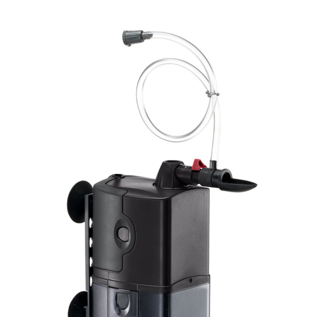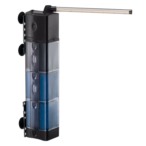 Blumodular is an innovative internal filtering system for aquariums equipped with modules that may be combined and added as you like. This aquarium filter lets various materials be used simultaneously, guaranteeing at the same time high power suction, excellent filtering capacity and rapid water flow. Inside the filter Blumodular, water runs through all filtering materials levels since liquid enters sideways, then it is carried towards the lower part and from the bottom starts afterwards to rise: in this way high oxygenation of water is ensured also thanks to the spray-bar and kit venturi (both included) used to create bubbles and water movement. Closing devices automatically close the water intake grill to prevent the dirt from returning to the tank during maintenance operations. Blumodular diffuser is multi-direction and nozzle is adjustable.