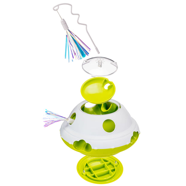 As the toy moves, it drops the kibble down to the lower level and the automatic feathered arm pushes it out randomly, making the interaction dynamic and stimulating. The random movements of the feathered arms catch your feline friend's attention, stimulating his hunting instinct. Finally, the removable feathered rod provides additional fun, arousing curiosity and keeping your cat active.