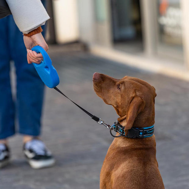 The Tape range includes different measures designed for dogs of different sizes and builds: Small with extendable tape up to 4 meters suitable for medium dogs up to a maximum of 15 kg in weight, Medium with tape length of 5 meters suitable for medium-large dogs up to a maximum of 25 kg in weight, Large with a length of 5 meters for large dogs up to 50 kg in weight. Among the colours at your disposal you will find the classic black, red and blue, pink is available in the Small size, all perfectly combinable with your friend's other accessories.