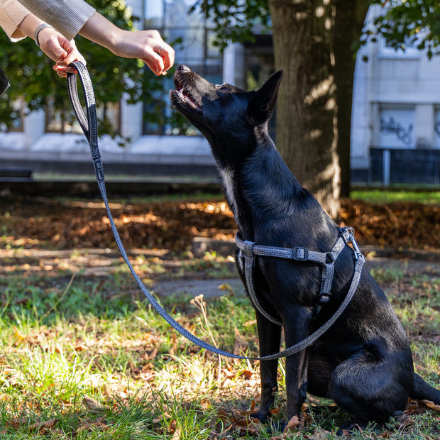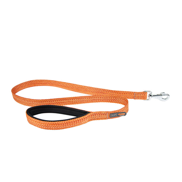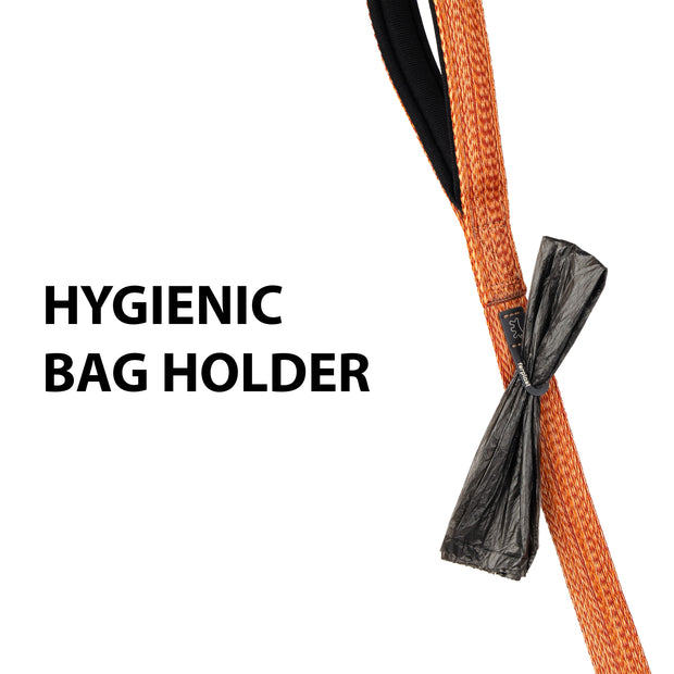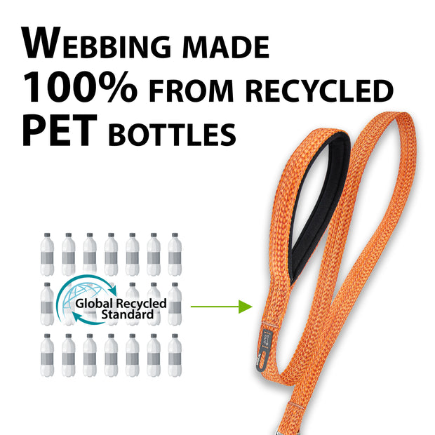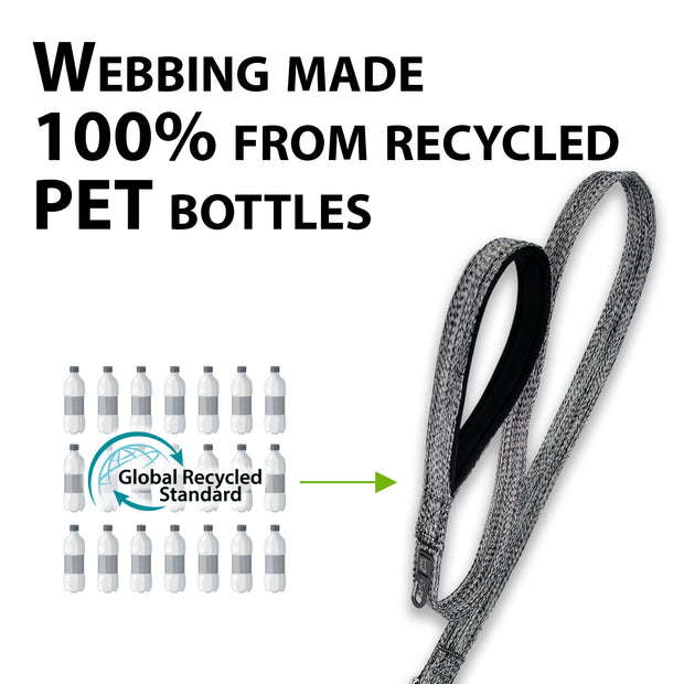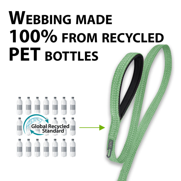 Dog leads made of certified recycled material. Soft handle and integrated hygienic bag holder.