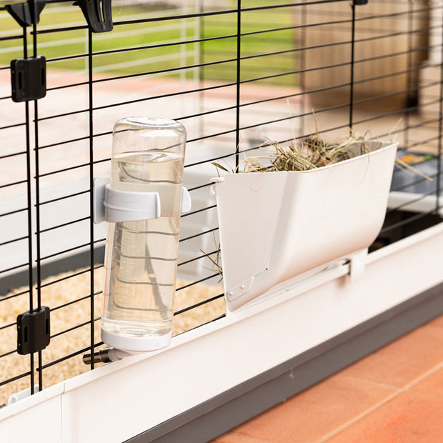 The Krolik 200 is equipped with accessories including feeding troughs for hay, water bottles, a bowl and a little house that has a partition with steps. Furthermore, on the side of the cage, you will find a comfortable ladder that allows the animal to go out and enter independently and move freely around the house.