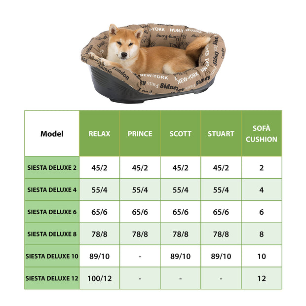 Siesta Deluxe plastic beds are available in six sizes, for dogs of all sizes. Siesta Deluxe 2, 4 ,6 and 8 are particularly suited also to cats. Take your time to decide which colour you prefer from our wide range.