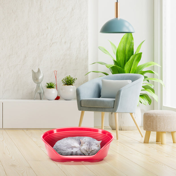This is a cosy indoor plastic bed for cats and dogs. Take a look at the design with rounded shape: the sides are high and comfortable and the front is low, with a useful chin-rest for your pet. It also has non-slip, supporting feet and the base has special slits, to allow the proper passage of air.