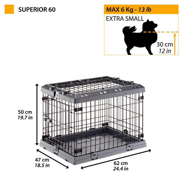 The Superior crates are equipped with large openings for greater flexibility of use both at home and on the road. The small Superior 60 model has 2 openings, one on the side and one on the top, while the large models have 3, one on the side, one on the top and one on the front. Furthermore, the roof can be completely opened and removed, convenient because it allows you to pet the dog. The doors, reinforced with a double safety lock, are large and allow easy access to your friend.