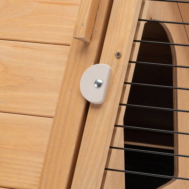 - Wooden rabbit hutch with large front door that can be opened from the outside and a safety lock