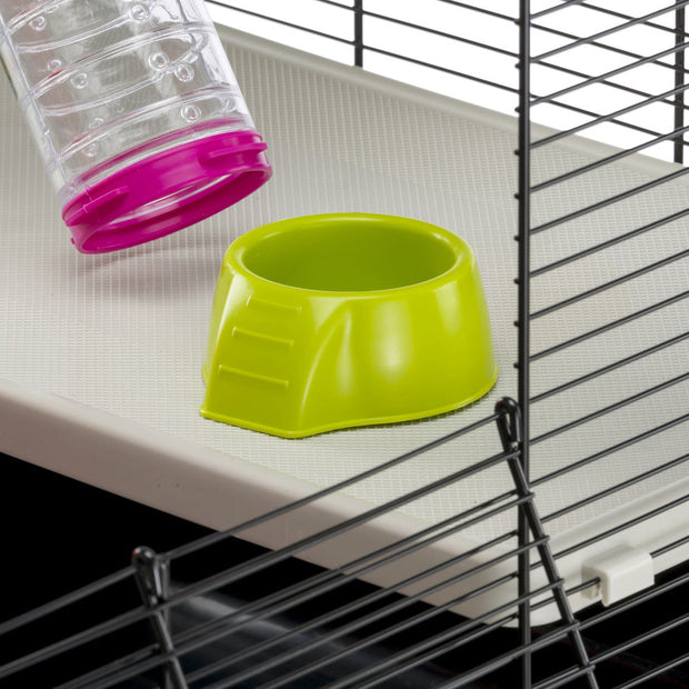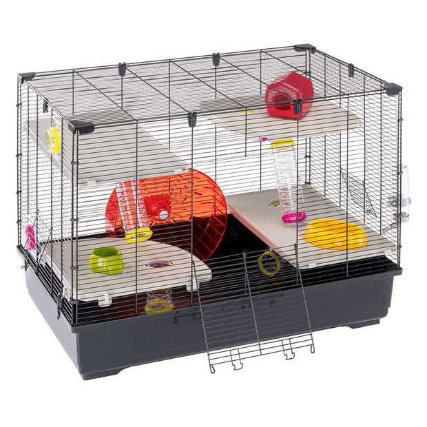The Village 80 hamster cage offers several floors designed to encourage play and movement, while ensuring maximum living comfort for your animal. The habitat is divided into different levels obtained through small shelves connected by transparent plastic tunnels. The different areas are designed for any time of day. The rodent will be able to eat, drink, rest or play thanks to the essential accessories included: feeder, bowl, drinker, nest and large hamster wheel.