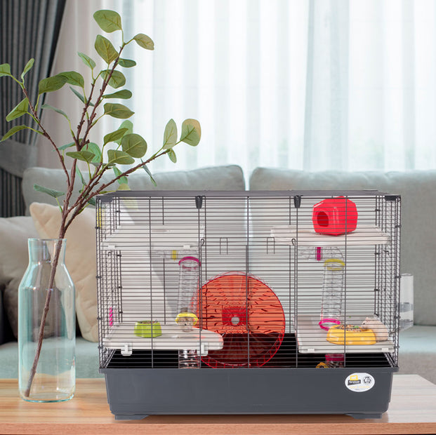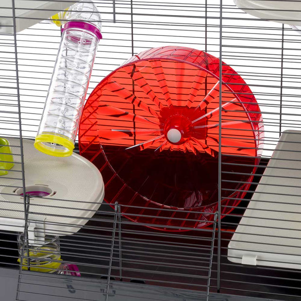 - Accessories included: 1 drinking bottle, 1 feeder, 1 bowl, 1 house, 2 tube sets, 4 shelves, 1 hamster wheel