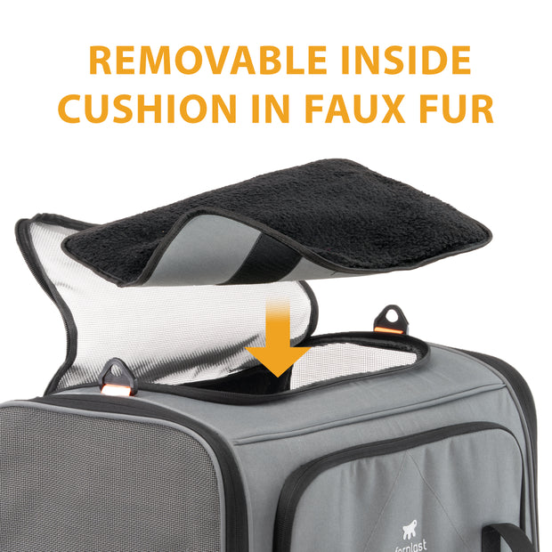 Additional features include a soft faux-fur cushion, removable and washable, to ensure maximum comfort, and the unique expandability that sets it apart from other carriers.