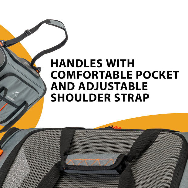 Designed with the owner's comfort in mind, this soft carrier features an ergonomic handle and padded adjustable shoulder strap, making it easy to carry in any situation. A back strap allows the carrier to be attached to a suitcase, making it perfect for air or train travel. Spacious integrated pockets are ideal for storing snacks, accessories, or travel documents, adding extra convenience. Reflective elements improve visibility in low-light conditions, enhancing safety during nighttime travels.
