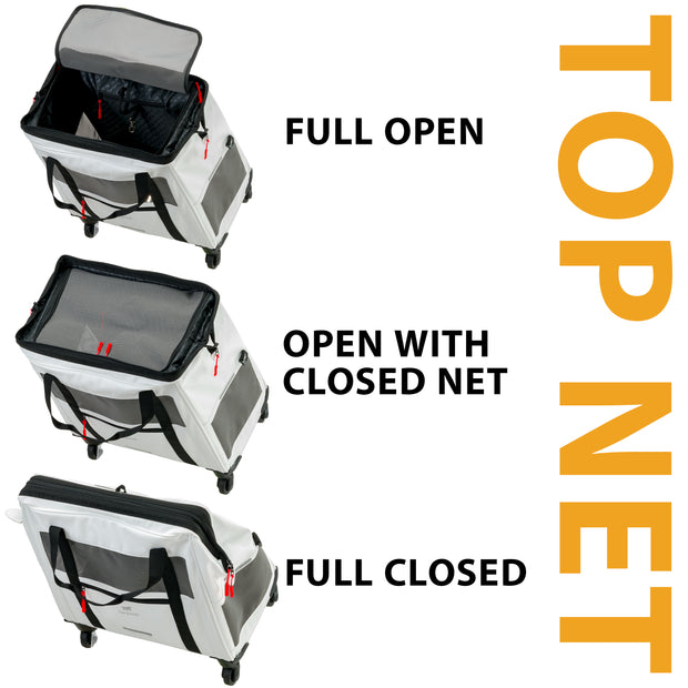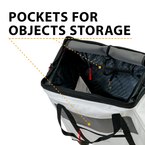 This pet trolley is also highly practical for owners, thanks to its spacious multi-purpose pockets, including one large internal pocket and a roomy external pocket, ideal for snacks, accessories, or documents. A rear strap allows the trolley to be attached to a suitcase, making it perfect for air or train travel.