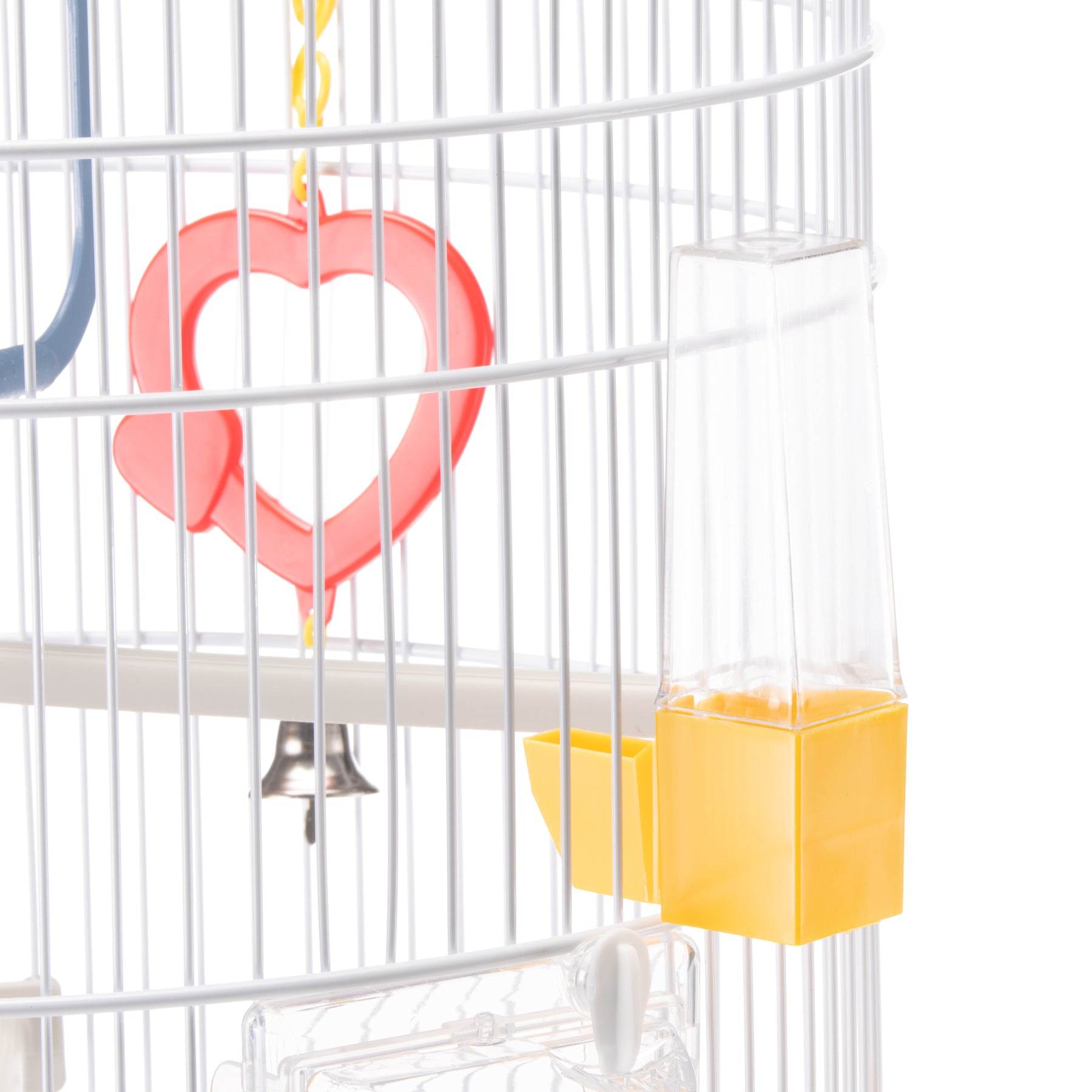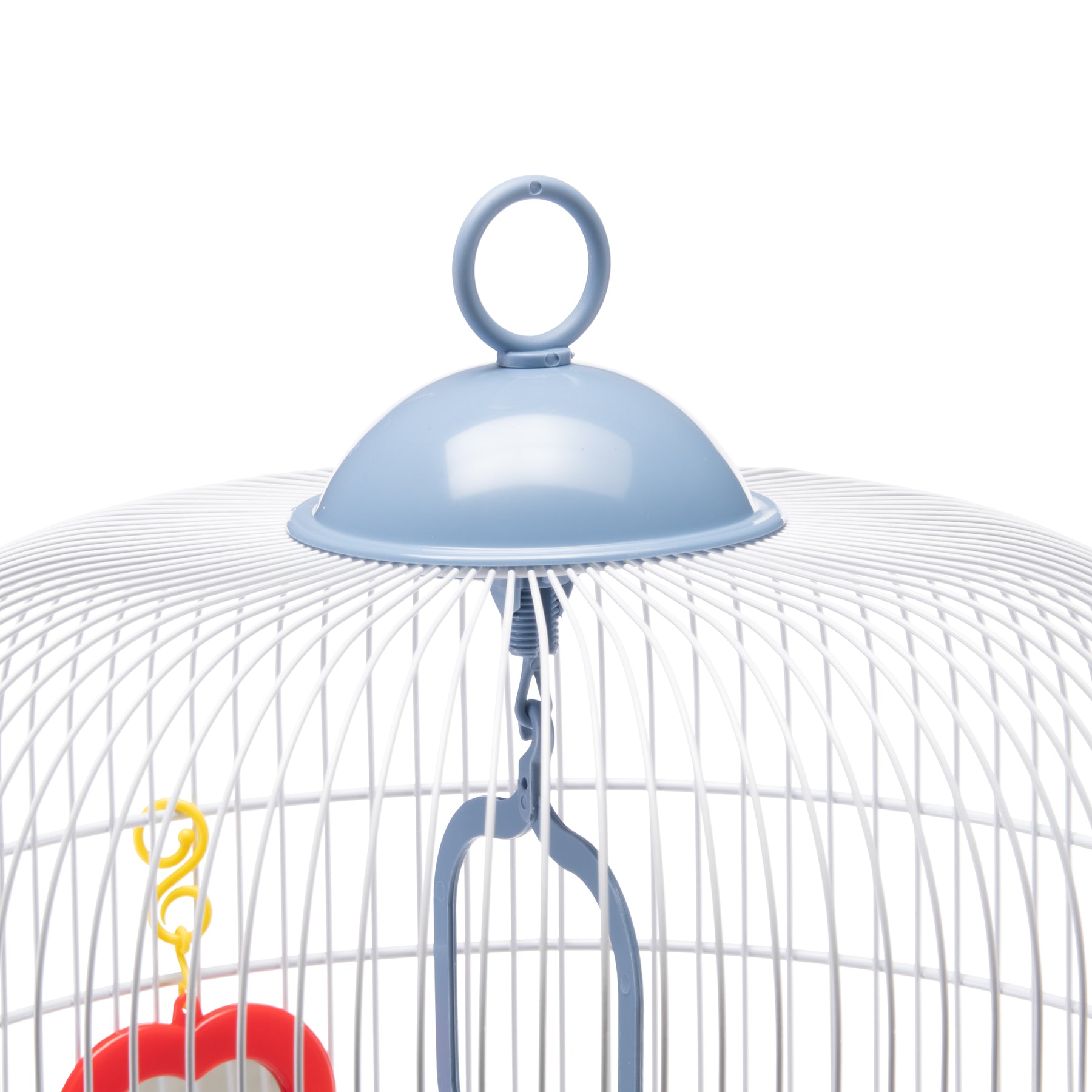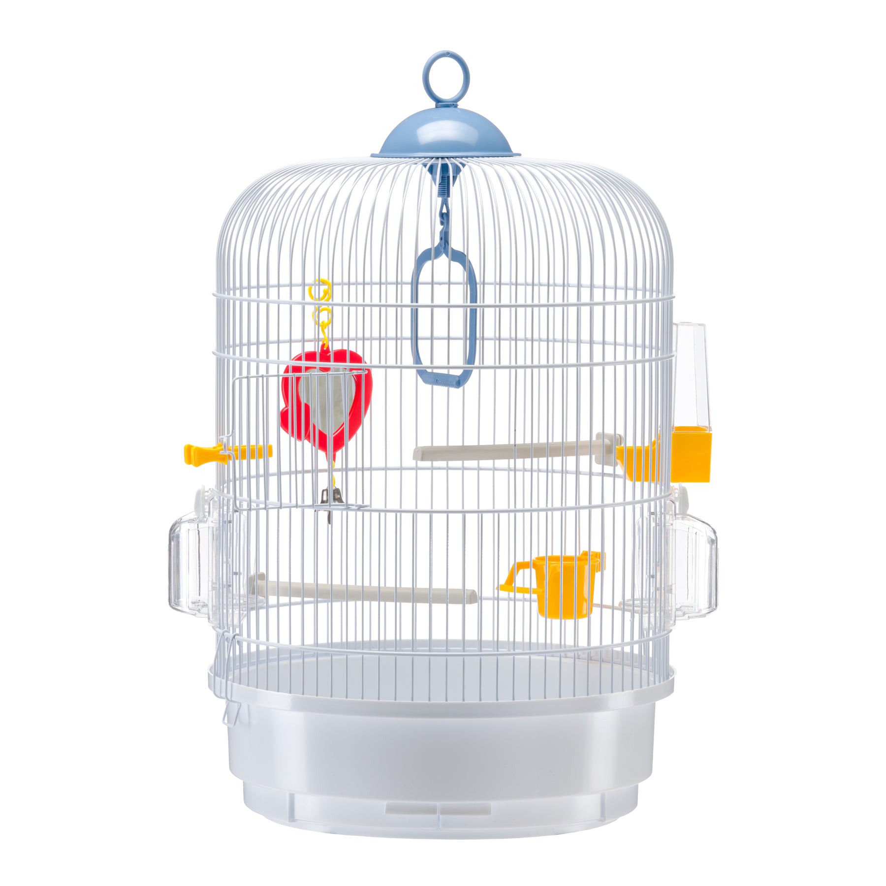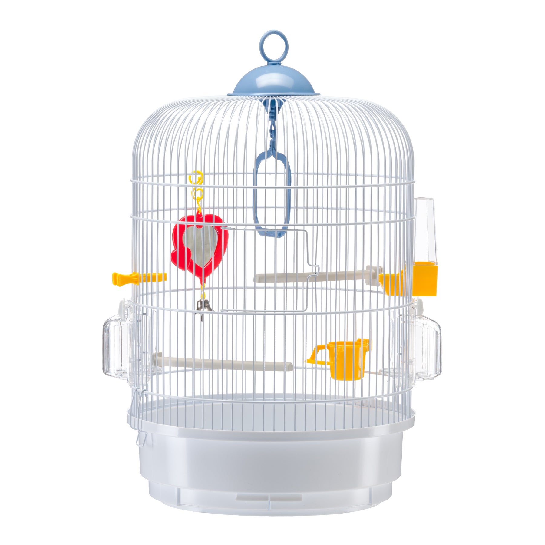 Regina is a small, elegant, round cage for canaries, exotic birds and other small birds. It is also available in a brass-coated version and can be placed on or hooked to one of our plastic stands. The base has two small plastic trays that make daily cleaning effortless. Like all Ferplast birdcages, Regina comes complete with accessories, including a swing and a mirror-toy with a little bell, plastic perches, a drinking bottle, a food clip, a feeder for mash and Brava 1 swivel feeders.