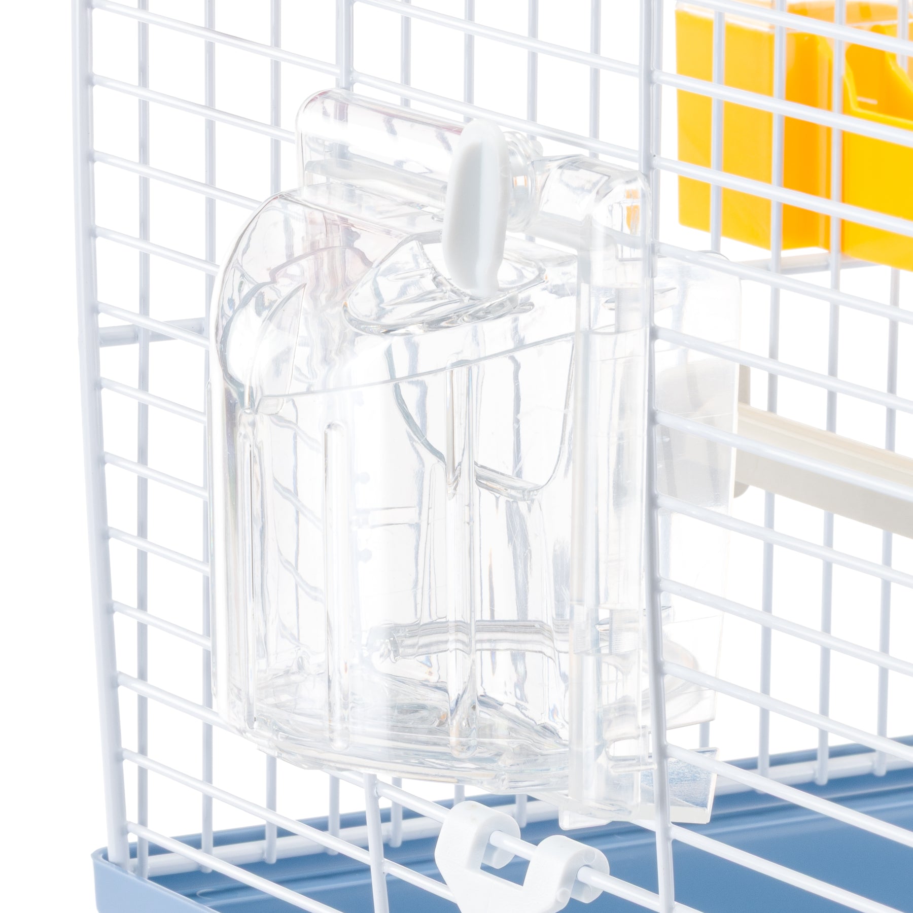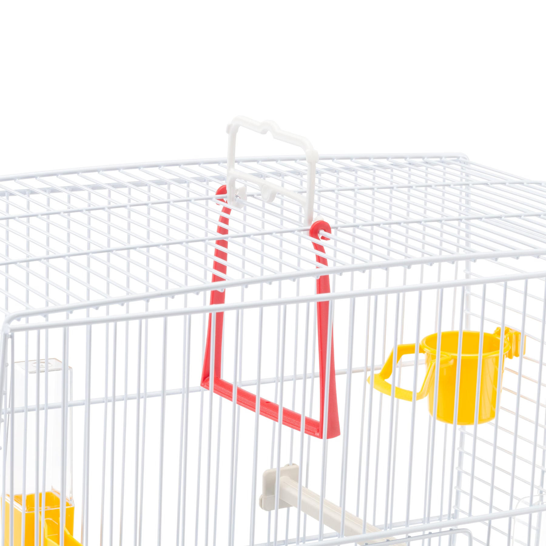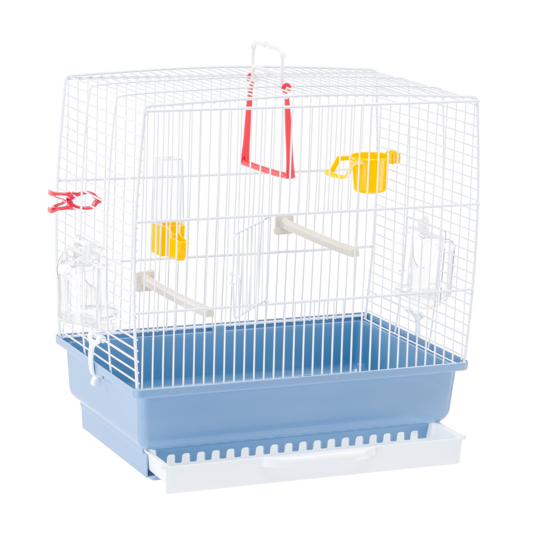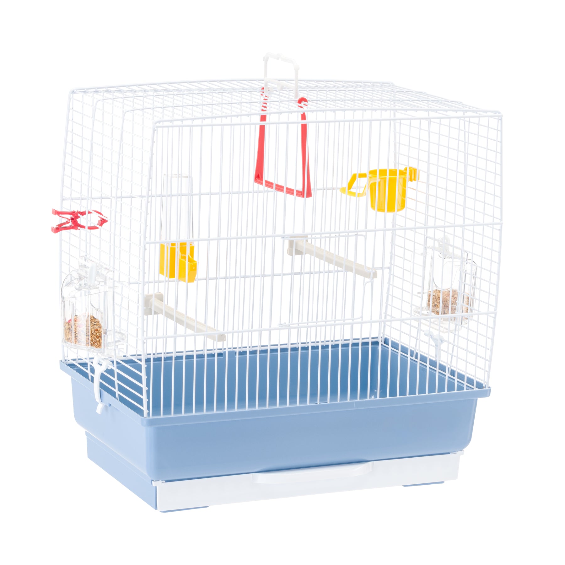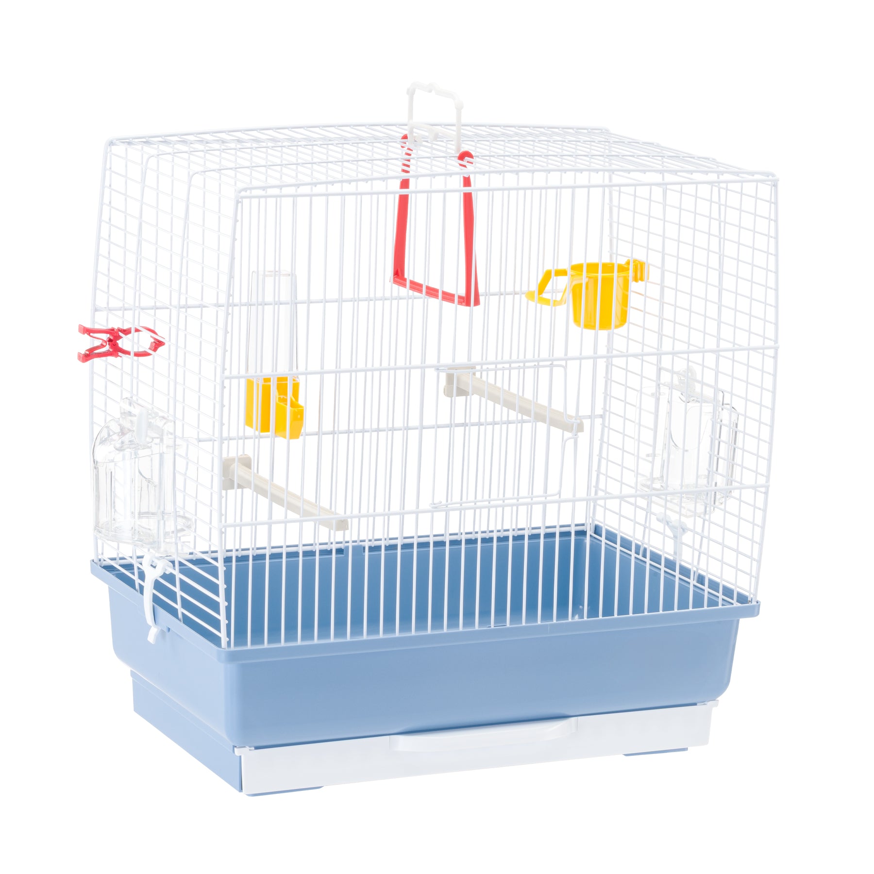 Rekord 2 is a cage with a rectangular base, ideal for canaries and other small birds. It has a handle for easy carrying and it is made of wire mesh that has been varnished white and has a sturdy plastic base. Rekord 2 comes complete with essential accessories, including plastic drinking bottle and perches, Brava 1 extractable swivel feeders, a swing, a food clip and feeders for mash. This birdcage is easy to look after and can be cleaned in an instant, thanks to its removable dirt-collecting tray. When necessary, you can completely remove the base, thanks to the clips on the sides.