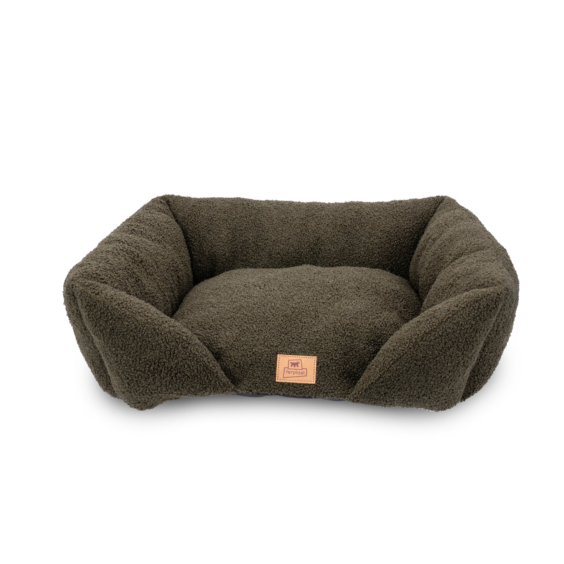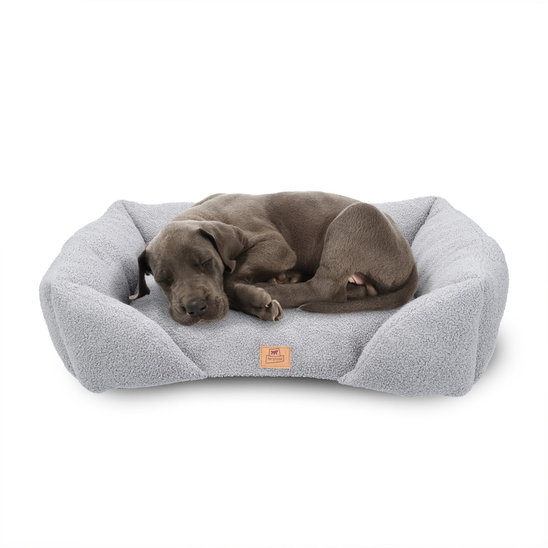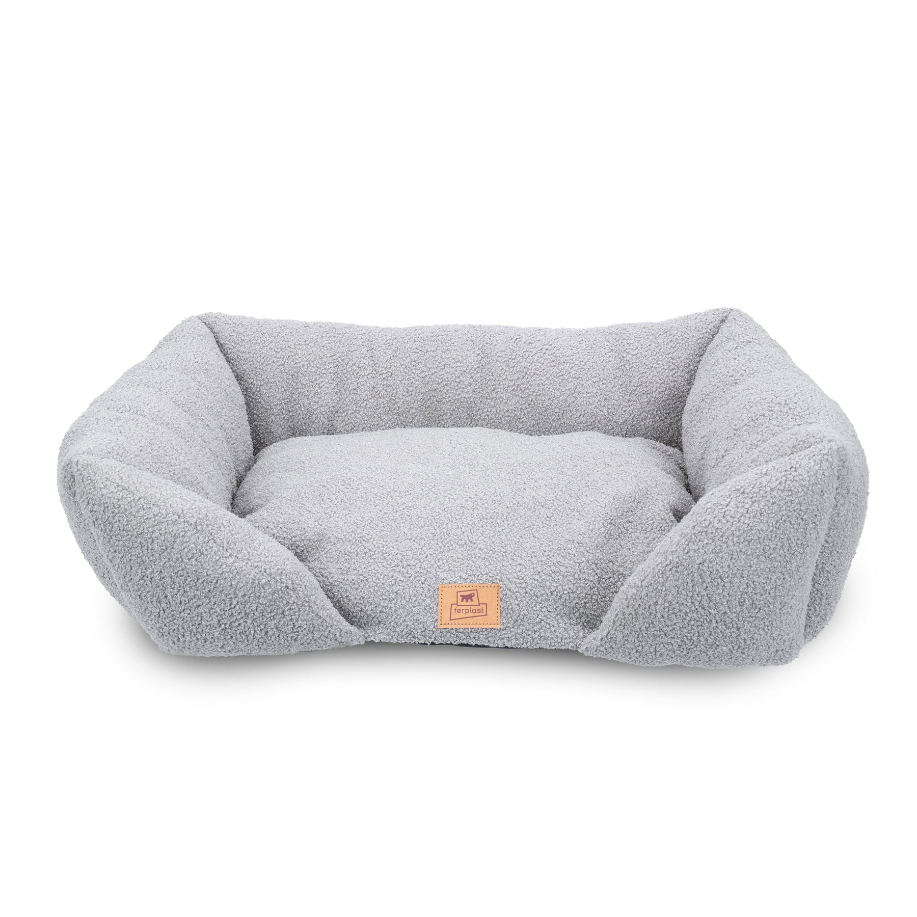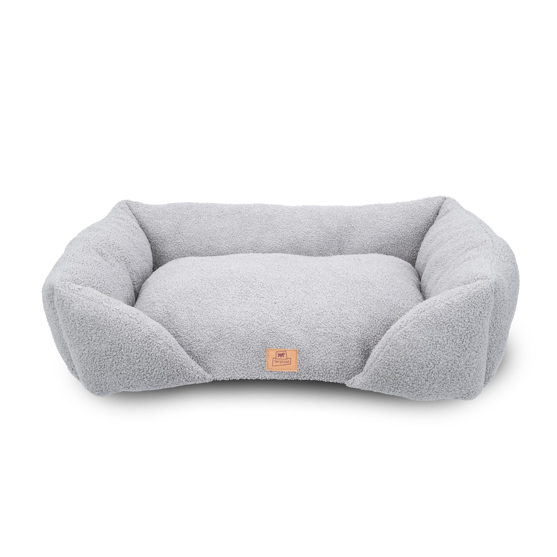 Padded sofa for dogs and cats in soft faux-bouclé fabric, with lowered entrance and raised sides for comfort and practicality
