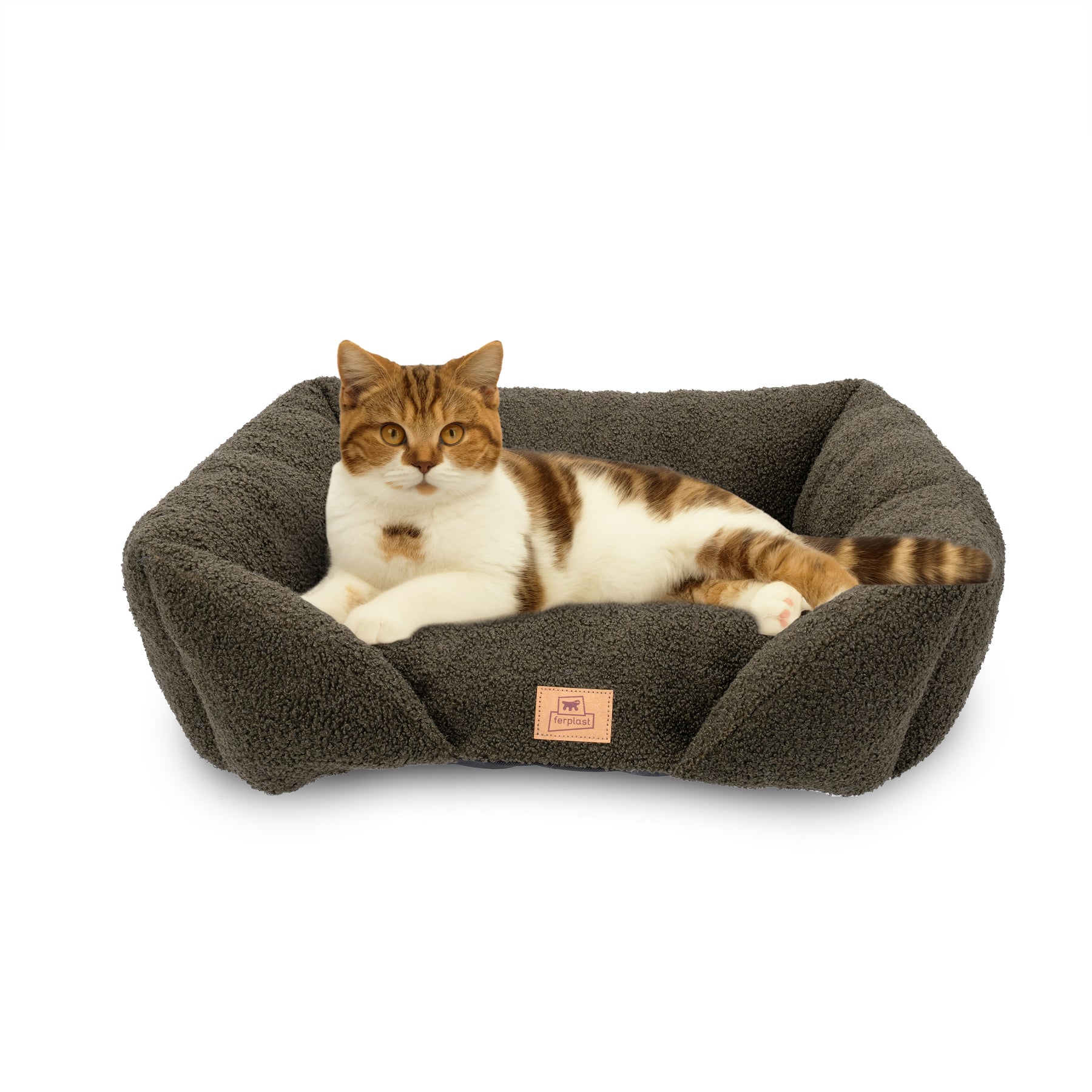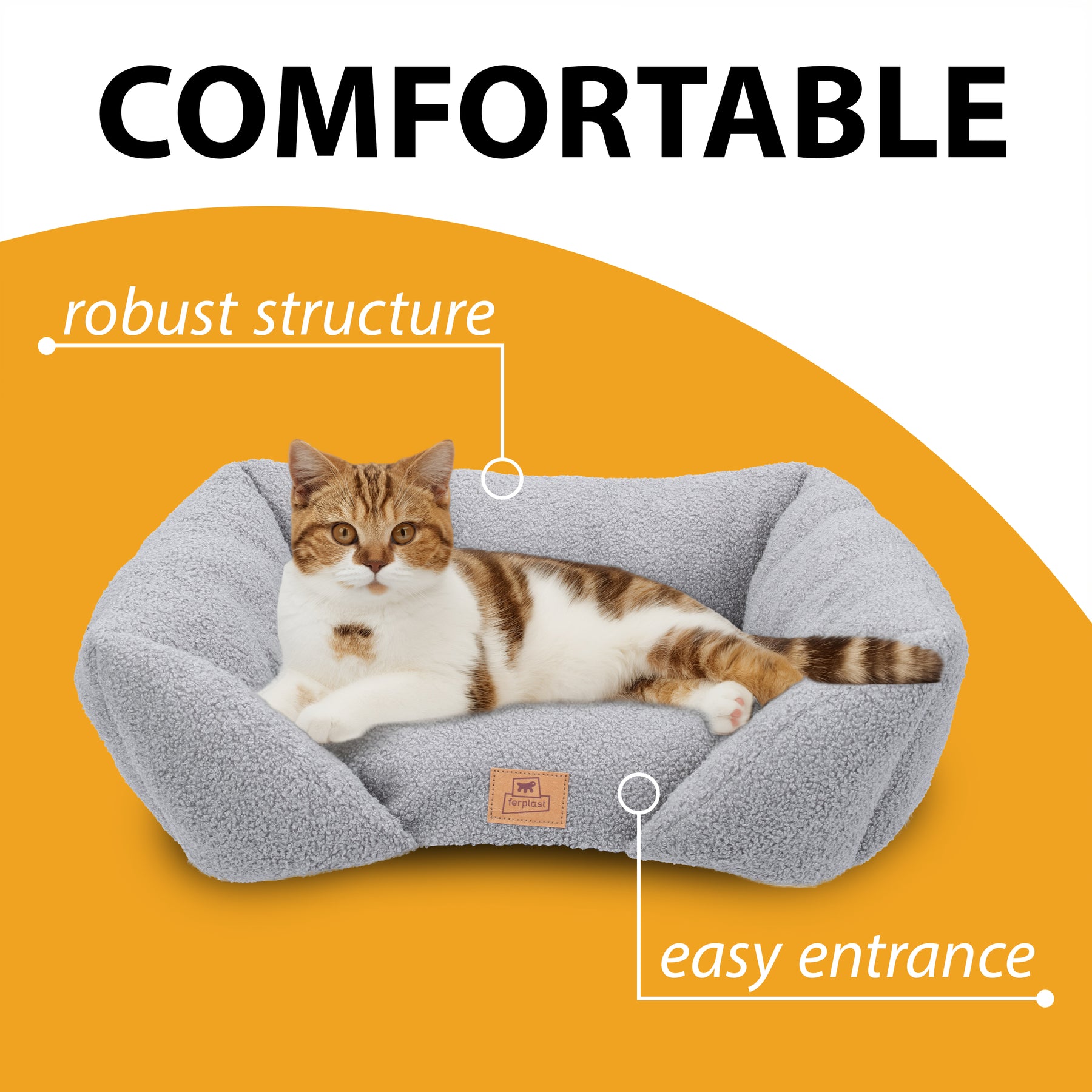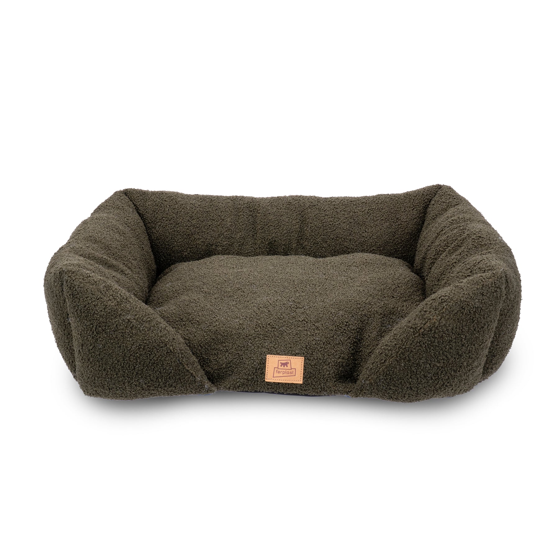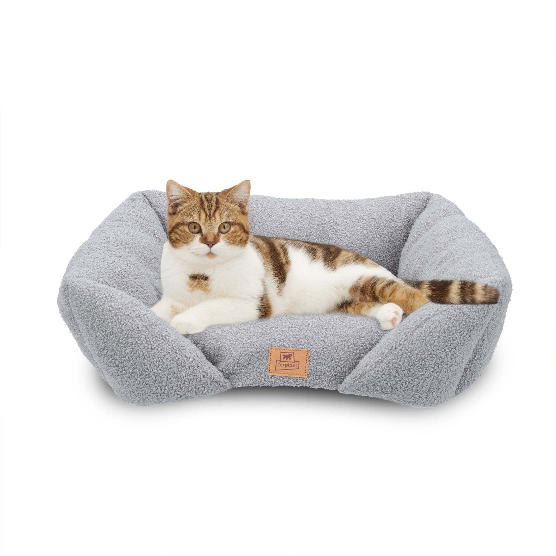 Padded sofa for dogs and cats in soft faux-bouclé fabric, with lowered entrance and raised sides for comfort and practicality