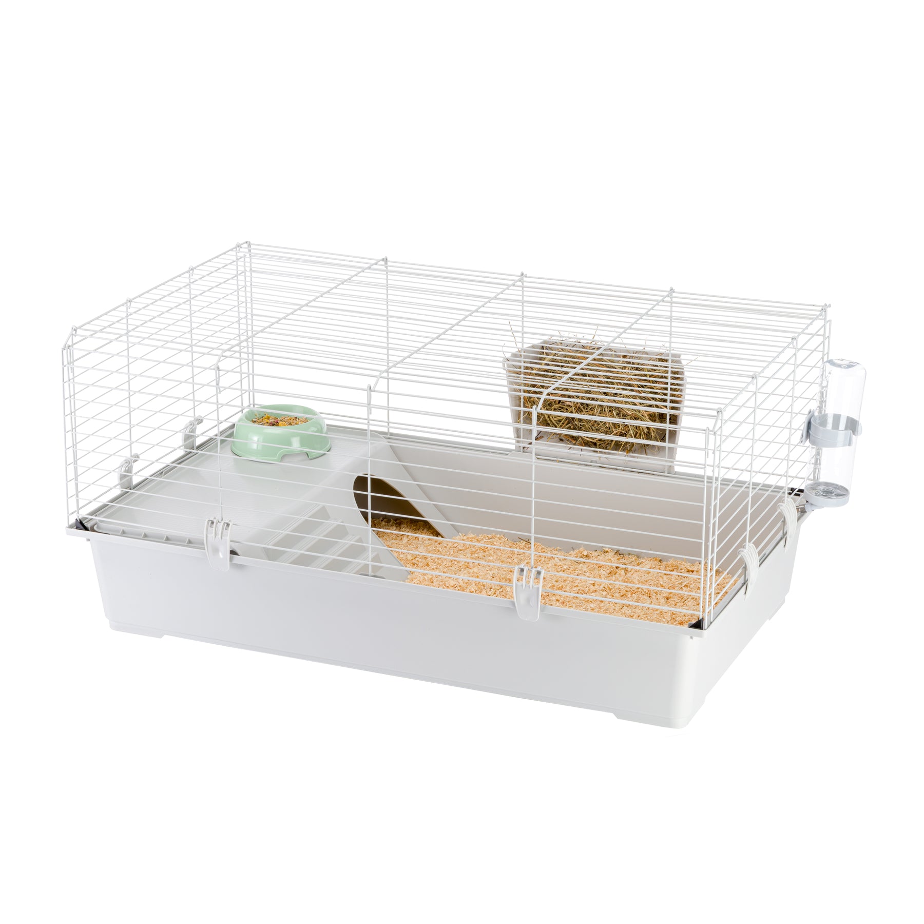 Perfect for rabbits and guinea pigs, Rabbit 100 has a deep coloured plastic bottom on which a metal mesh is placed. The mesh is coated with special corrosion-resistant paint, and can be completely lifted from the front side, for easier access. This also makes everyday cleaning easier. For deeper cleaning operations, simply detach the bottom by unhooking the snapping flaps on the sides, which were designed for extra safety.