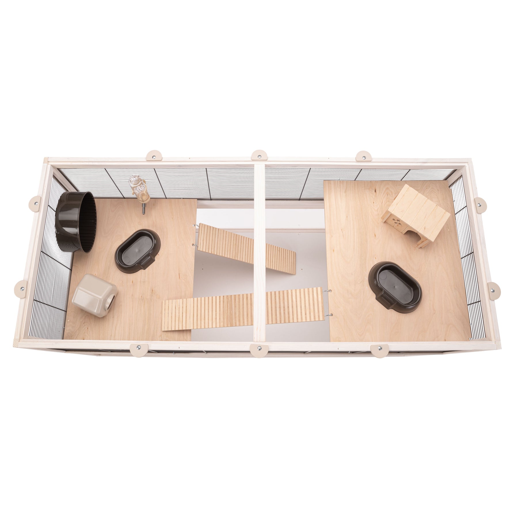 Practicality is at the heart of Domster's cage design, with an opening roof for easy access and faster cleaning. The structure is designed for easy separation of top and base, simplifying maintenance and keeping the habitat tidy at all times.