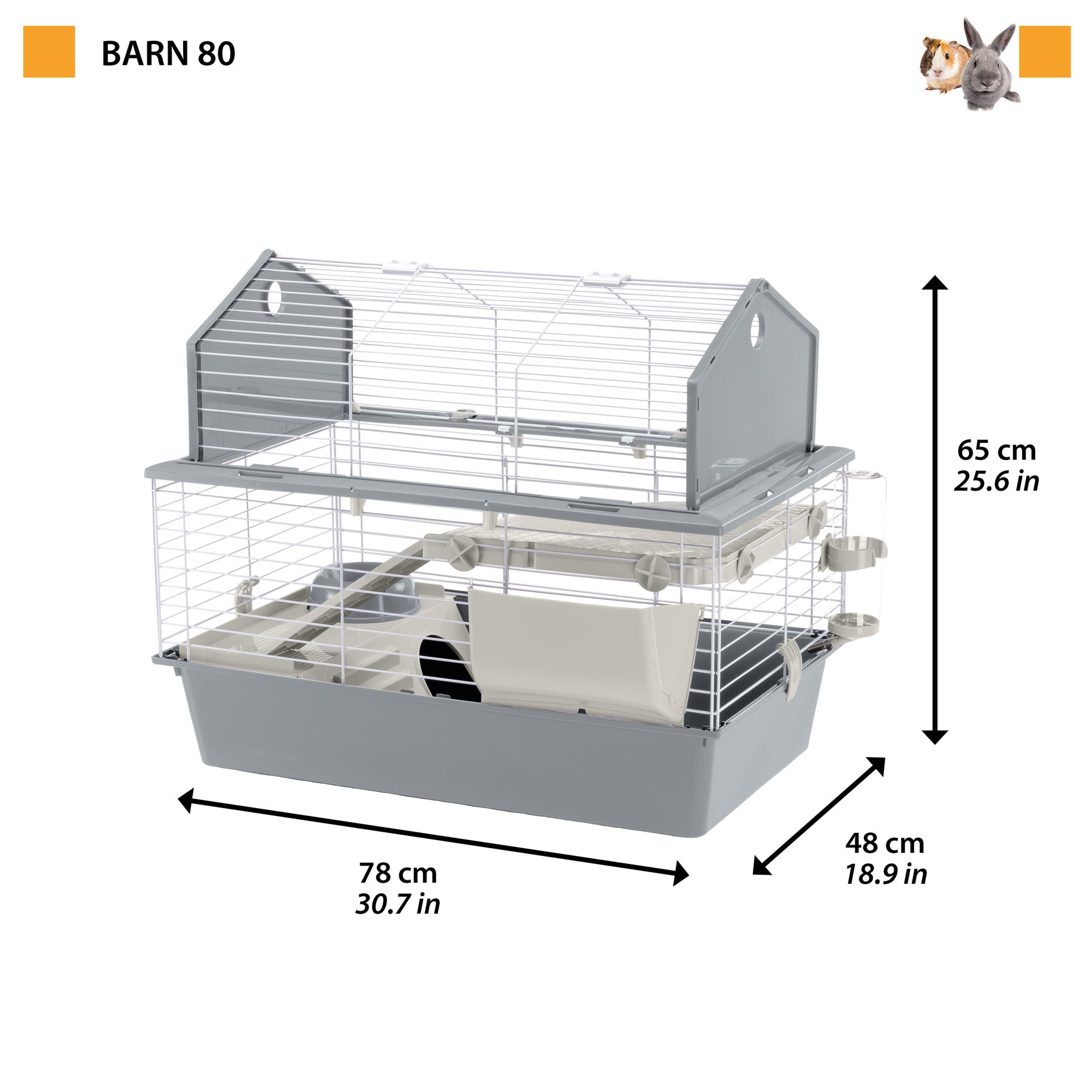 Barn has a typical barn shape with raised roof. This fun cage is entirely dedicated to rabbits; very roomy, it comes with eating trough, bowl and water spout. On the lower level there is a practical little house that is perfect for resting. A set of plastic stairs leads upstairs, where your rabbit can enjoy a comfortable \living-room\. Made of sturdy varnished metal mesh, Barn can be fully disassembled. It takes up little room and comes with a base made of thermoplastic resin that keeps from spilling out. Its front part comes with a practical sliding door with lock, especially designed to keep your pet safe.