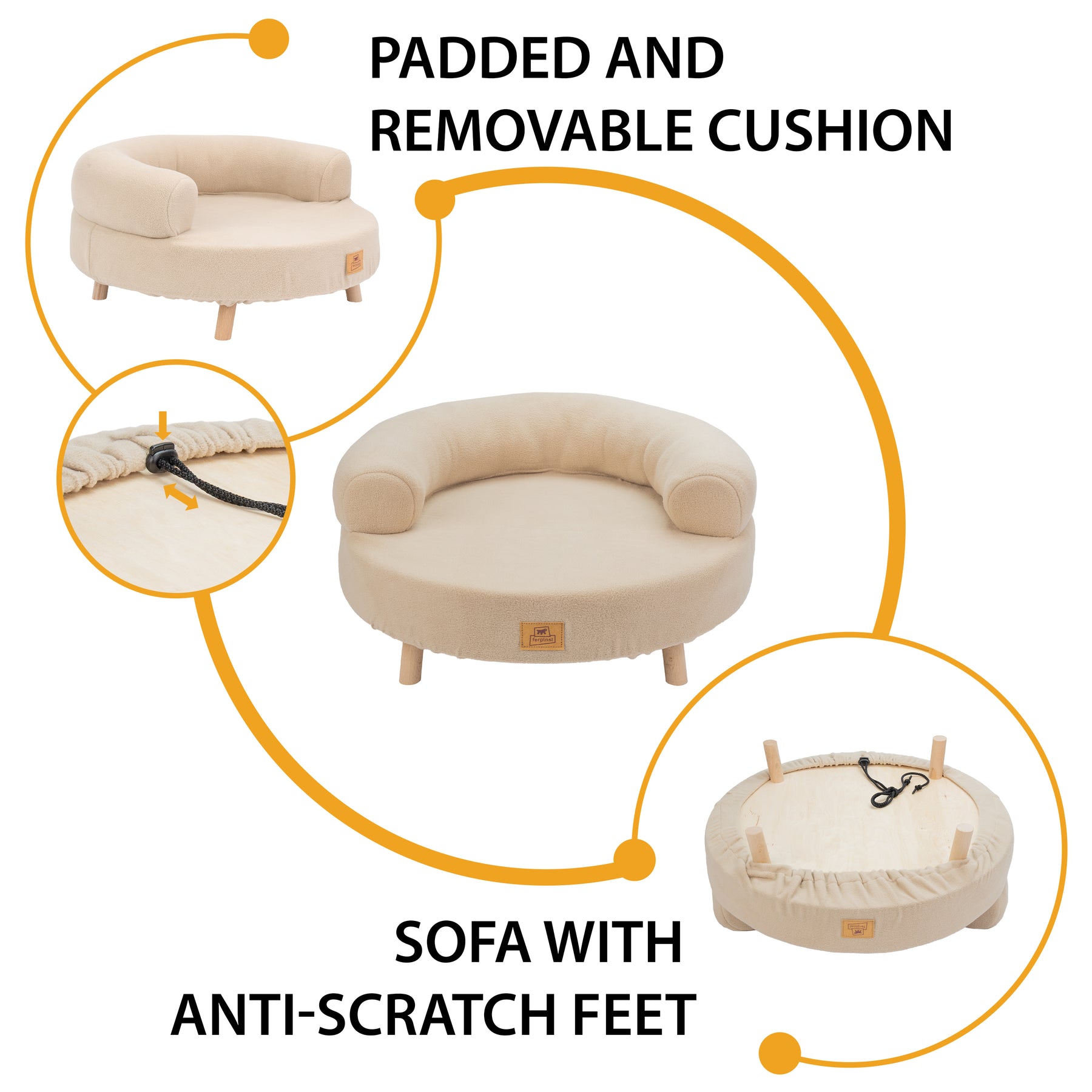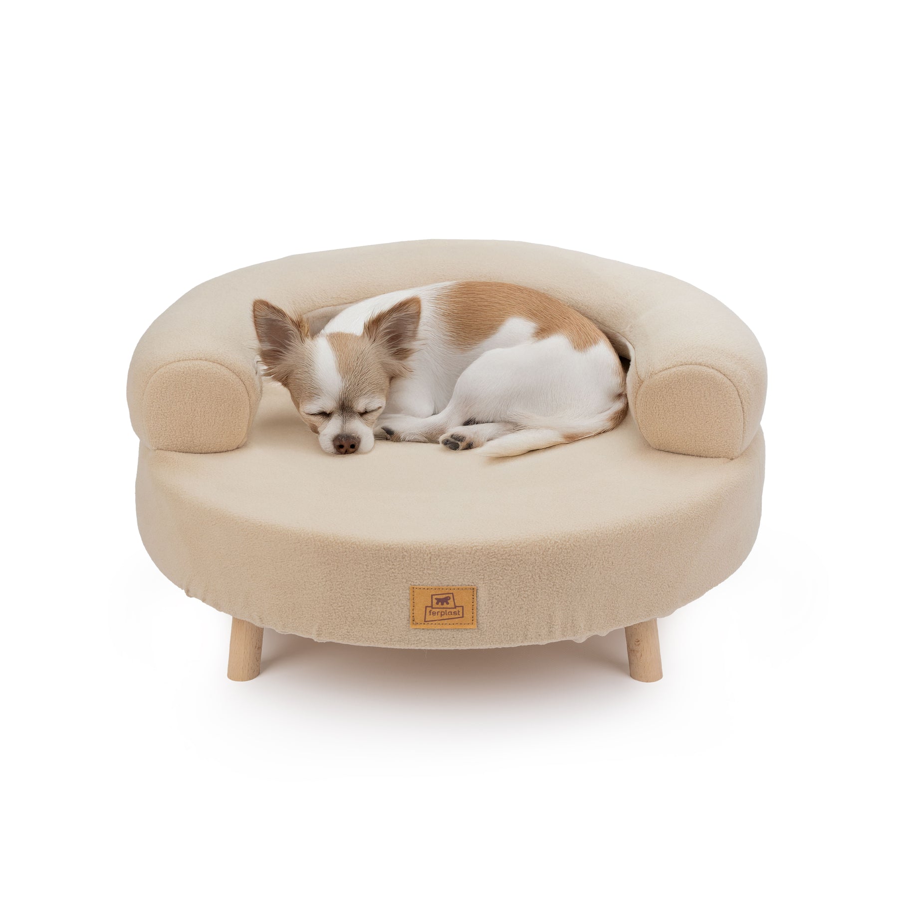 Aki is a wooden armchair-style pet bed created to offer small dogs and cats a soft, enclosed and reassuring resting space. The FSC™ certified Nordic pine structure ensures stability and natural charm, enhancing its enveloping round shape.