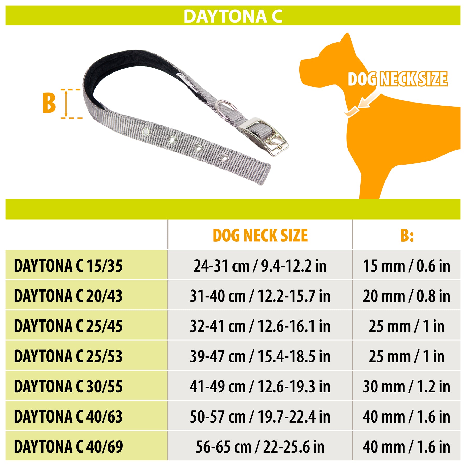 Very comfortable on your friend's neck thanks to the soft padding that covers the inside, Daytona C is a dog collar made of nylon, a material that makes it particularly resistant to stress from the animal. Adjustable through the four holes, it has a sturdy chromed metal buckle that ensures an effective and safe closure. To adapt to all dog sizes, Daytona C is available in various sizes, with a circumference ranging from a minimum of 27 to a maximum of 69 cm and a width of the tape ranging from 15 to 40 mm. This collar can be chosen in a wide range of colors.