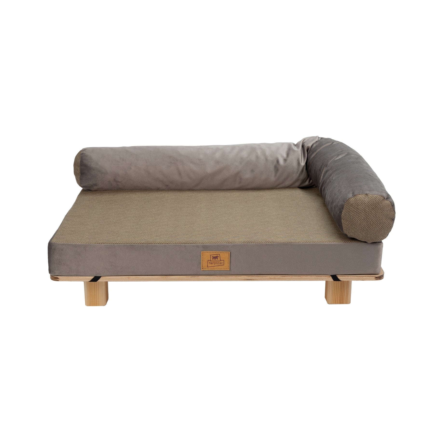 The mattress is made from soft tweed fabric with elegant tone-on-tone velvet details in warm brown shades, offering both visual richness and cosy comfort. The padding is soft yet supportive to ensure a proper resting posture, while the padded roll serves as a comfortable backrest and headrest. The mattress is washable at 30°C, helping maintain long-lasting cleanliness.