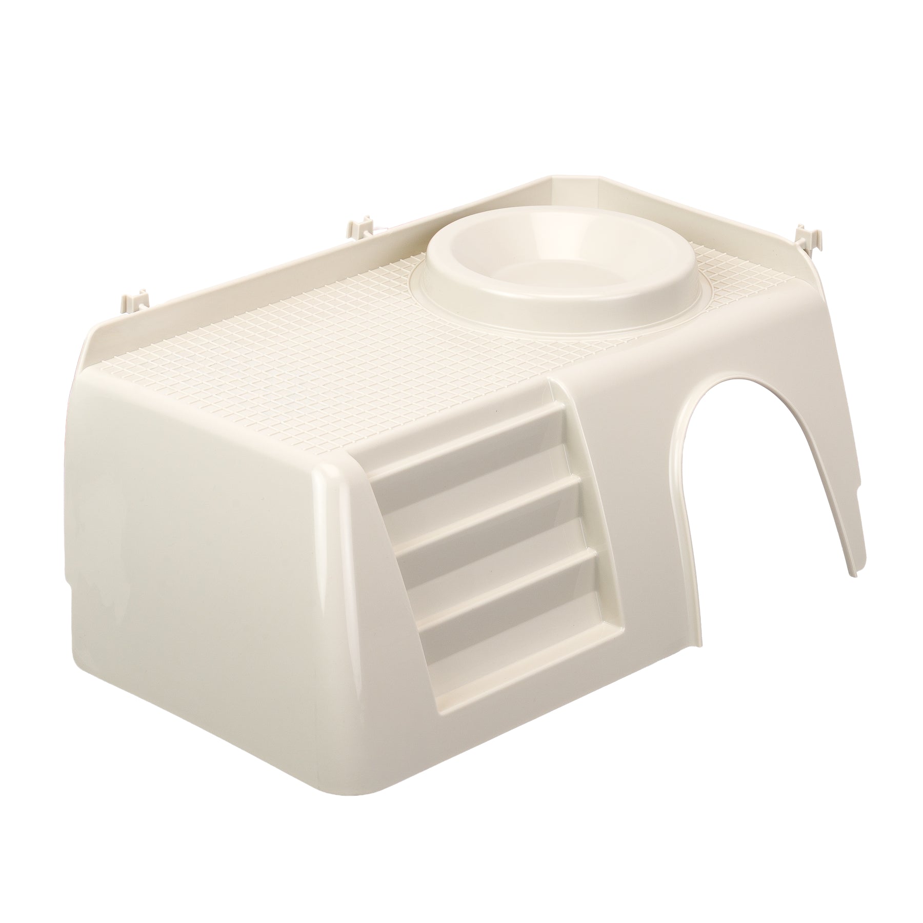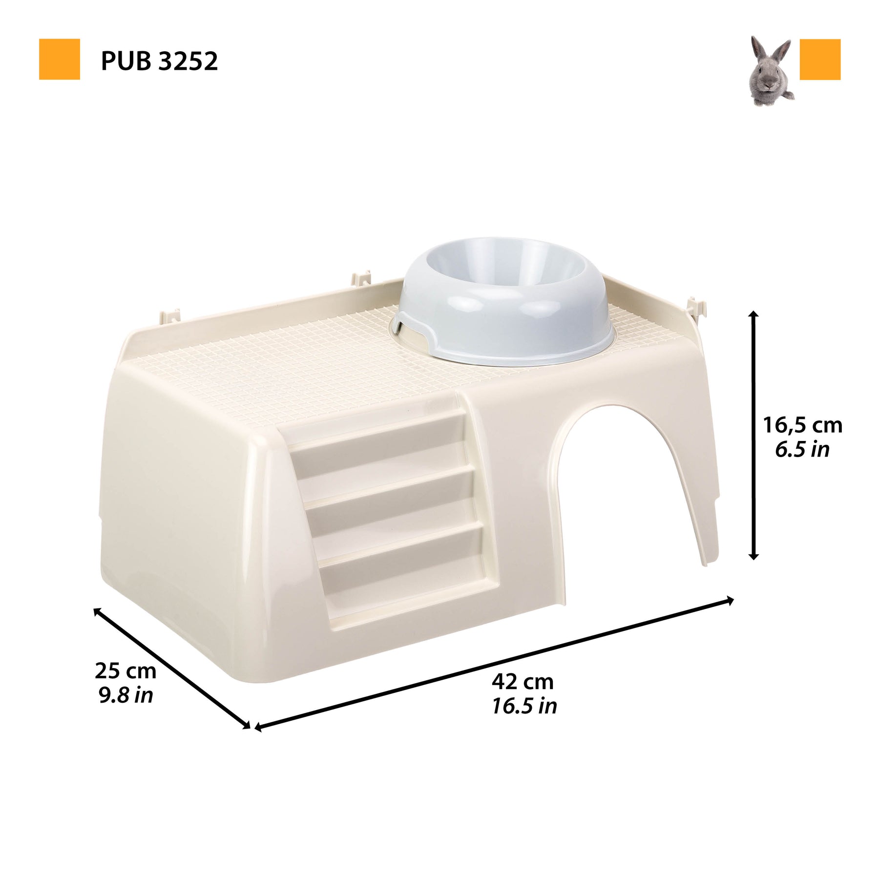The little house for rodents PUB 3252 is ideal to offer shelter and maximum privacy to your furry friend, perfect for cages for rabbits like Rabbit 140. Made of sturdy plastic, it has a lateral entrance, useful removable bowl for food and comfortable steps to facilitate the animal to climb over. A practical hooking system allows you to fix it firmly to the habitat of your friend.
